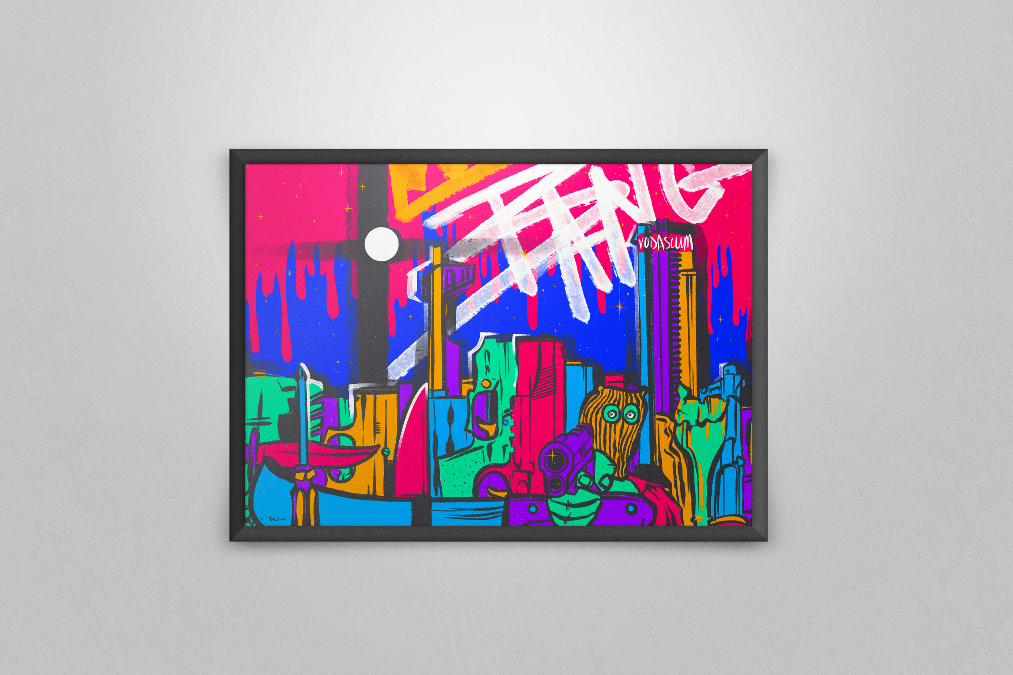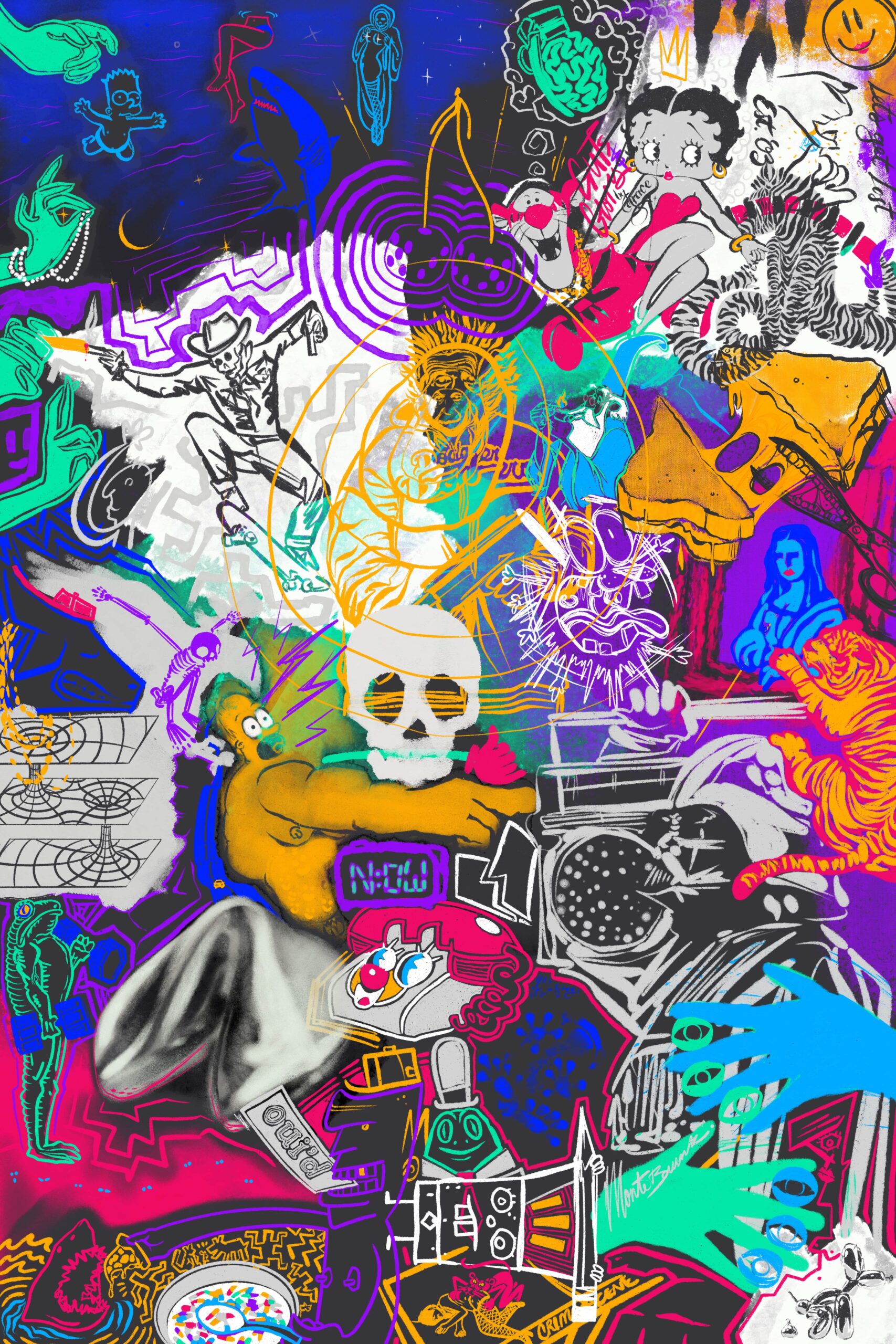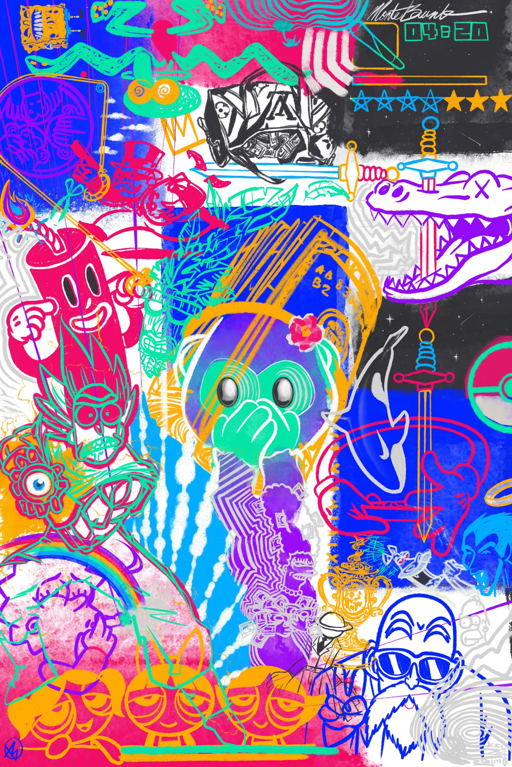 I then get them professionally printed by none other than Silvertone International on Rembrandt Canvas or carefully selected archival paper in Epson Ultrachrome high pigment acid-free inks. I then take my museum quality canvas and go to town with Posca, Mont Marte  paint markers, and various other inks, paints and occasionally some ash from my joint. I go over some parts to achieve a certain effect, or add (and sometimes remove) some details across the canvas, and you are left with a 1/1 mixed media on canvas artwork by Monte Baunk.