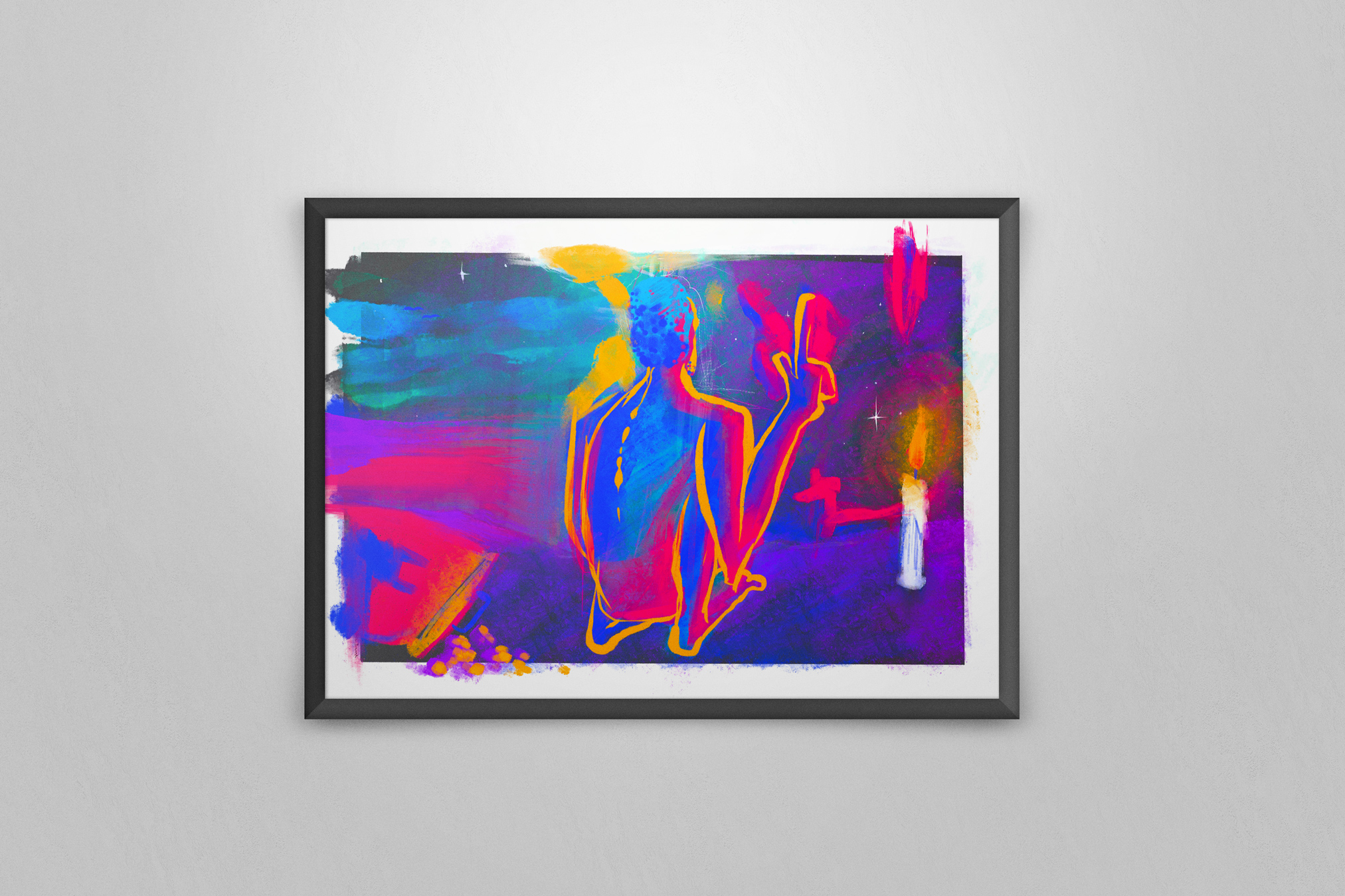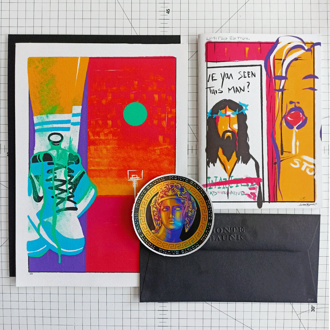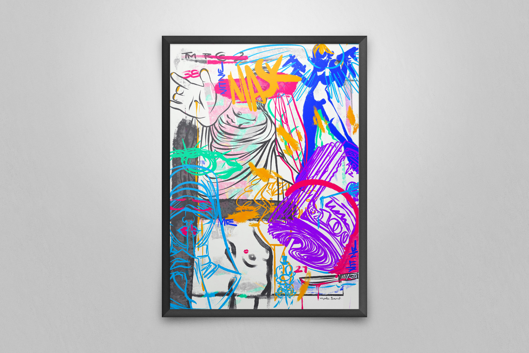 I then get them professionally printed by none other than Silvertone International on Rembrandt Canvas or carefully selected archival paper in Epson Ultrachrome high pigment acid-free inks. I then take my museum quality canvas and go to town with Posca, Mont Marte  paint markers, and various other inks, paints and occasionally some ash from my joint. I go over some parts to achieve a certain effect, or add (and sometimes remove) some details across the canvas, and you are left with a 1/1 mixed media on canvas artwork by Monte Baunk.